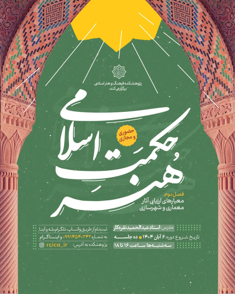 رویداد آموزشی«حکمت هنر اسلامی» با نگاهی به «معیارهای ارزیابی آثار معماری و شهرسازی»، روزهای سه‌شنبه به مدت ده جلسه با تدریس استاد عبدالحمید نقره‌کار از ساعت ۱۶ الی ۱۸ به صورت مجازی و حضوری برگزار می‌شود.